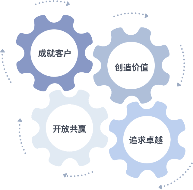 成就客户是一切决策的出发点,,,,创造价值是衡量所有工作的标准,,追求卓越是我们做事做人的态度,,开放共赢是我们的格局也是最终的结果。。价值观的齿轮环环相扣,,,,推动着组织里的每个人不断向前。。