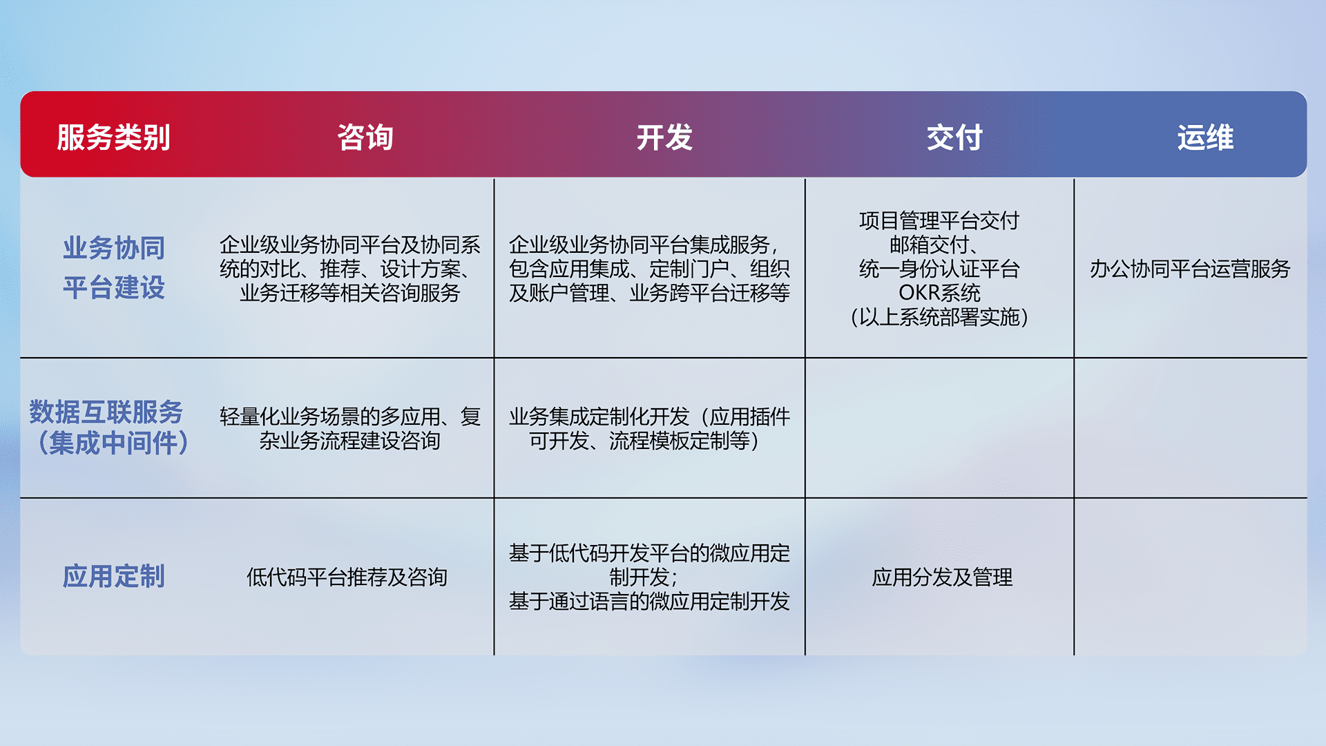 针对钉钉、、、、企微、、、、IDaas等平台级产品提供产品的规划、、、方案、、、交付、、定制化开发等服务,,,实现如统一协同办公、、、智能客户服务、、、、混合会议管理、、、智能数据查询、、等业务场景,,实现数字化转型。。。。